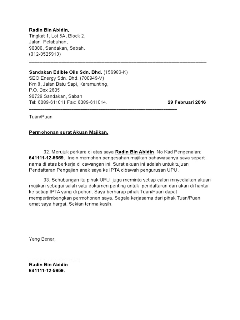 Surat Rasmi Ayah Permohonan Akuan Majikan Pdf